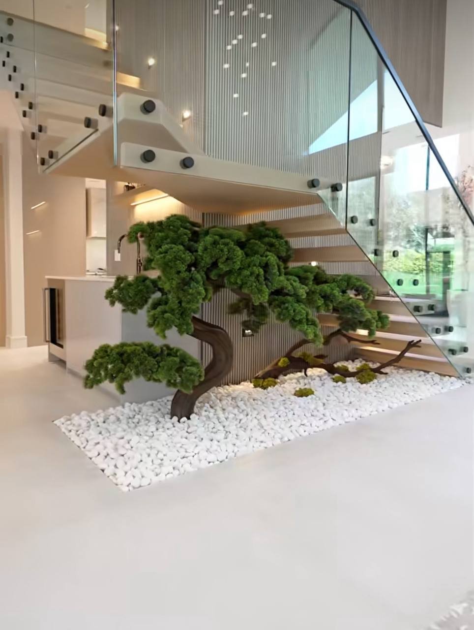 يجمع بين نباتات صناعية متنوعة بألوان وأشكال طبيعية، مزروعة وسط أحجار بيضاء تعكس جمال الديكور وتضيف لمسة عصرية أنيقة.
